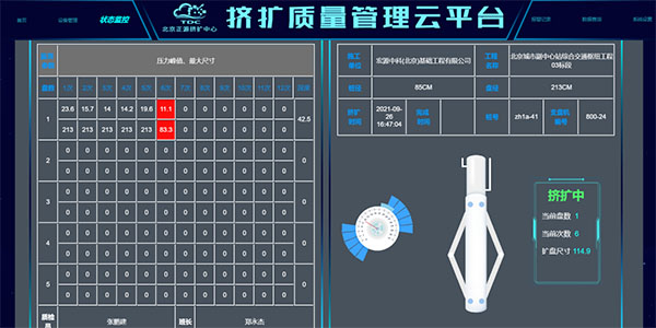 宏源中科(北京)基礎工程有限公司承接了此項目部分樁基工程,采用專有的擠擴支盤灌注樁技術。在施工過程中,應用可視化支盤質監儀檢測設備,可以實時直觀的看到地下擠擴機的擠擴動作,并把擠擴尺寸實時反映在操作屏上,并同步上傳至云端及客戶端。解決了支盤樁擠擴隱蔽性強、質量不易控制的缺點;在出現不符合設計要求時及時報警提醒,同時將擠擴數據生成表格作為項目質量檢測資料。該檢測設備采用工序中過程監測和完成后成果檢測保證了支盤樁全流程質量控制。